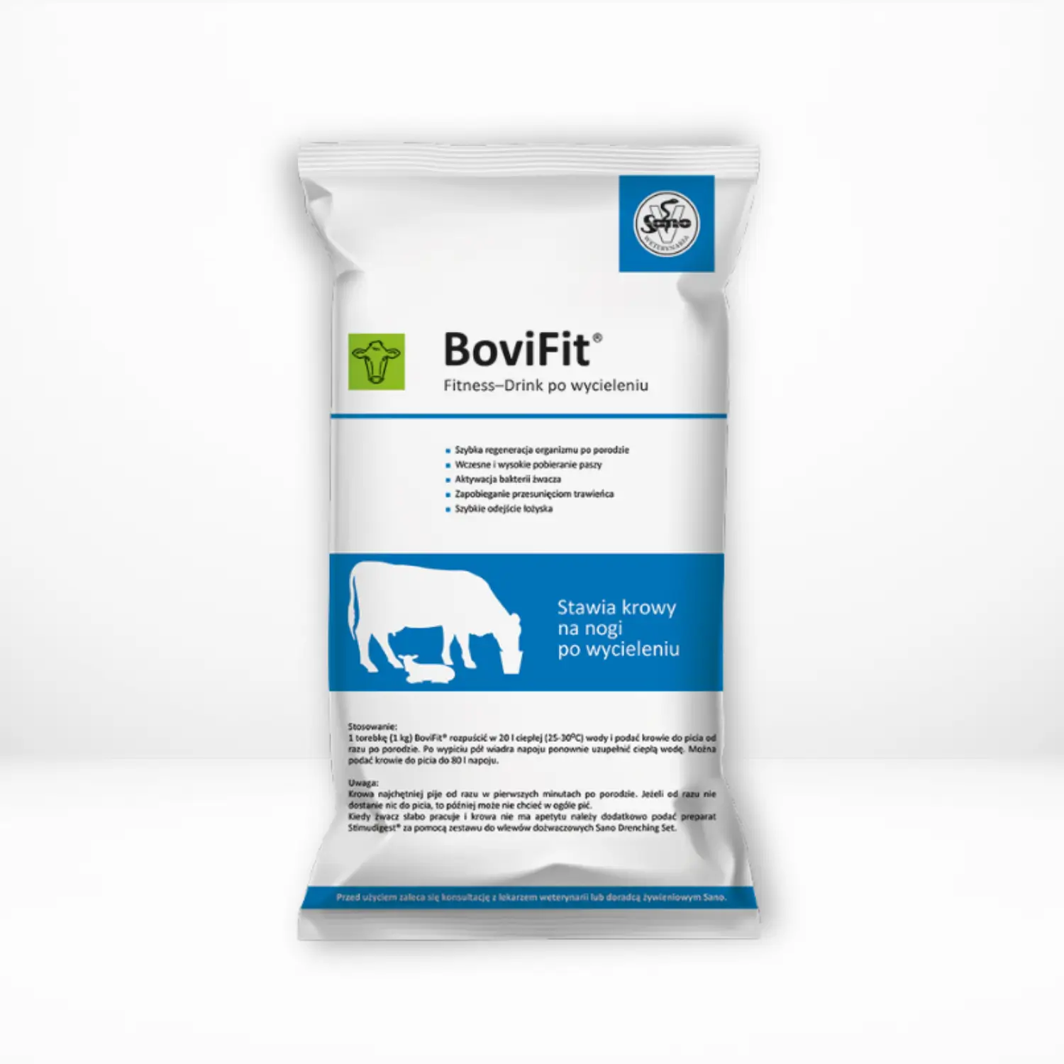 1KG rozpuścić w 20L ciepłej wody i podać krowie do picia zaraz po wycieleniu.