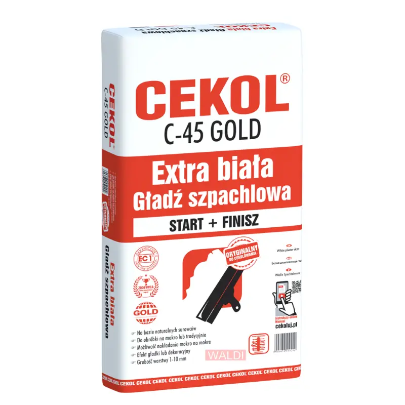 CEKOL C45 jest doskonałym materiałem do przygotowywania ścian i sufitów wewnątrz budynków przed malowaniem, tapetowaniem itp. Także do renowacji starych tynków, tynkowania całych ścian, szpachlowania płyt gipsowo-kartonowych (do spoinowania i uzupełniania rys i pęknięć zaleca się stosowanie specjalnej zaprawy szpachlowej CEKOL C-40). Gładź szpachlowa CEKOL C-45 umożliwia wykonanie bardzo gładkich płaszczyzn. Dzięki unowocześnionej formule nadaje się do nakładania ręcznego oraz maszynowego.
