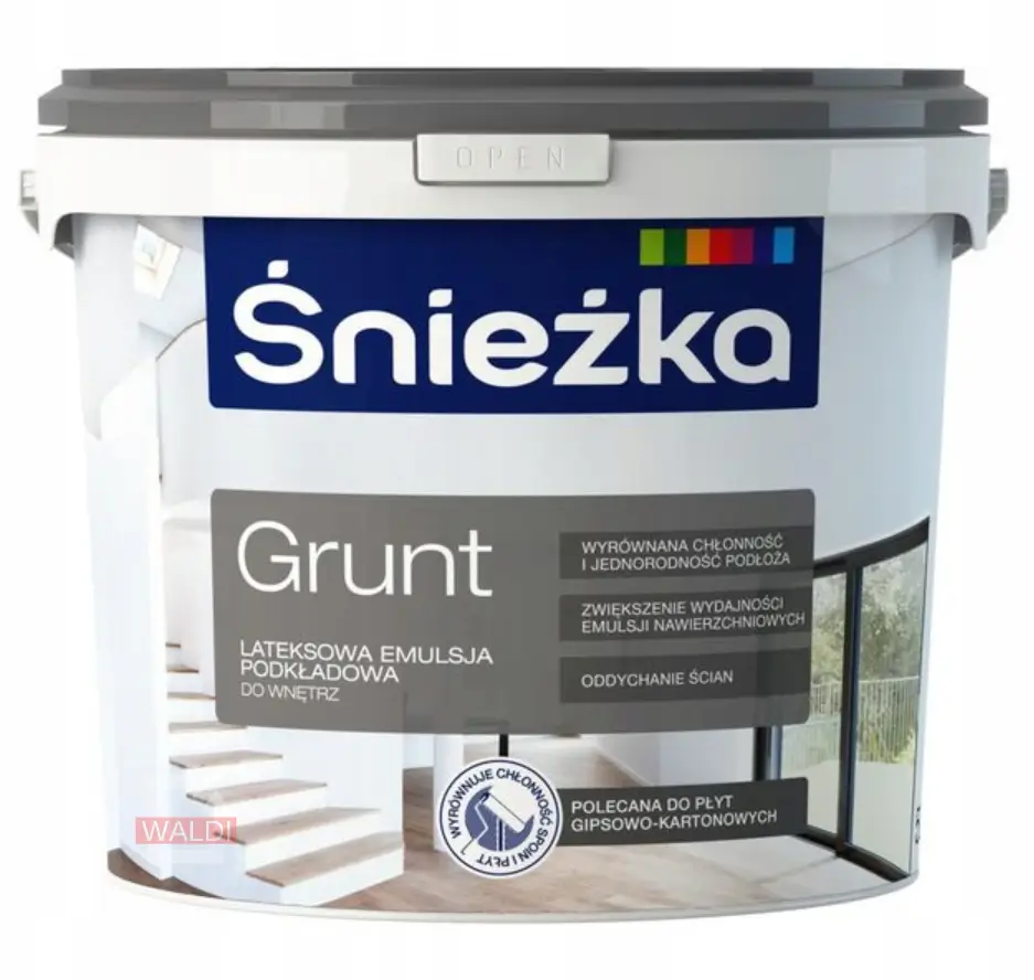 Śnieżka Grunt dzięki specjalnym dodatkom nakłada się grubą warstwą i niweluje różnice w fakturze i barwie podłoża. Wnika w podłoże poprawiając przyczepność warstwy farby nawierzchniowej oraz zmniejsza jej zużycie.