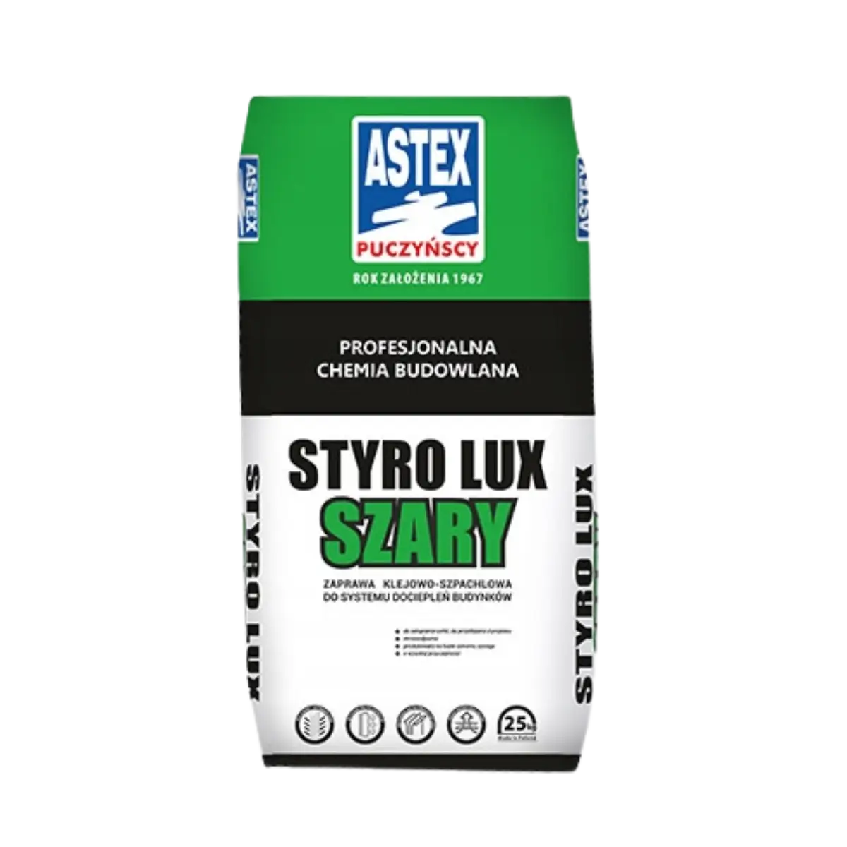 Zaprawę klejową STYRO LUX SZARY stosuje się do klejenia płyt styropianowych i układania siatki zbrojeniowej w systemie dociepleń budynków pod różne rodzaje tynków dekoracyjnych. Zaprawa nadaje się do wypełniania i szpachlowania drobnych ubytków ustabilizowanego podłoża, jak i również na wyrównywanie powierzchni. Może być stosowana wewnątrz i na zewnątrz budynków.