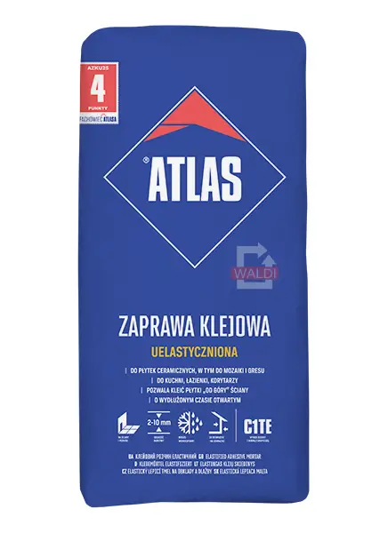 Atlas zaprawa klejowa uelastyczniona to mieszanina najwyższej jakości spoiwa cementowego, kruszyw i specjalnej kom-pozycji środków modyfikujących, w tym polimerów. Uszlachetniona formuła sprawia, że produkt uzyskuje najwyższe parametry techniczne w swojej klasie i znajduje szerokie zastosowanie w budownictwie mieszkaniowym.